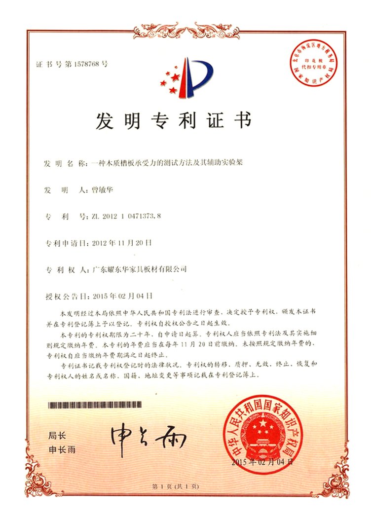 一種木質(zhì)槽板承受力的測(cè)試方法及其輔助實(shí)驗(yàn)架發(fā)明專利證書