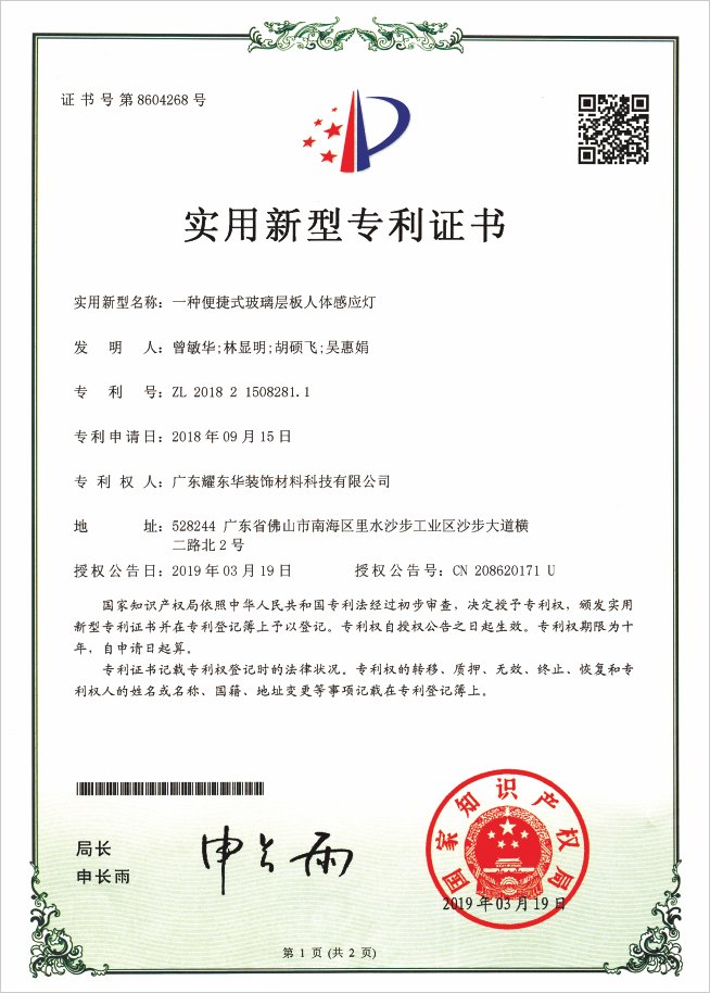 一種便捷式玻璃層板人體感應(yīng)燈專利證書