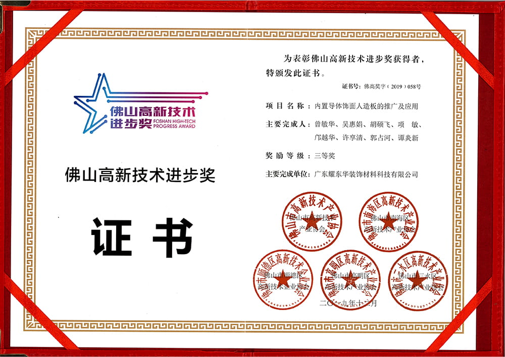 2020年1月8日,在佛山市科技局指導下,由佛山市高新技術產(chǎn)業(yè)協(xié)會聯(lián)合各區(qū)高新協(xié)會共同主辦的第二屆“佛山高新技術進步獎表彰大會”在佛山中歐中心國際會議中心隆重舉行!耀東華公司“內(nèi)置導體飾面人造板的推廣及應用”項目,榮獲“佛山高新技術進步獎三等獎”。