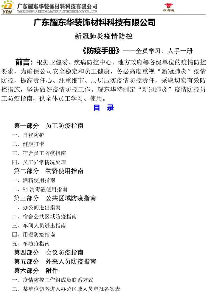 面對疫情,耀東華公司第一時間成立疫情防范小組,建立疫情防控管理體系,制定了防控工作預(yù)案,對工廠各區(qū)域進(jìn)行消毒殺菌處理,配備了體溫檢測儀,醫(yī)用口罩,醫(yī)用酒精、消毒劑等防控物資,并通過公司微信公眾號、微信工作群等多渠道向員工宣傳疫情防控方法。同時,我公司還安排各部門負(fù)責(zé)人對人員進(jìn)行管理登記,及時掌握外來員工返工情況及健康狀況,對有湖北旅住史或接觸史的人員,一律要求嚴(yán)格隔離14天以上,嚴(yán)密關(guān)注其健康狀況,并配合工業(yè)區(qū)做好復(fù)工前的疫情防控、登記、核查等工作,整個廠區(qū)除了緊急消防出口外,只設(shè)置一個出入口,詳細(xì)詢問和登記員工、外來人員狀況,發(fā)現(xiàn)異常情況及時報告和處理,并發(fā)放員工《防疫手冊》,盡最大努力保護(hù)好員工的健康安全,做到安全復(fù)工。