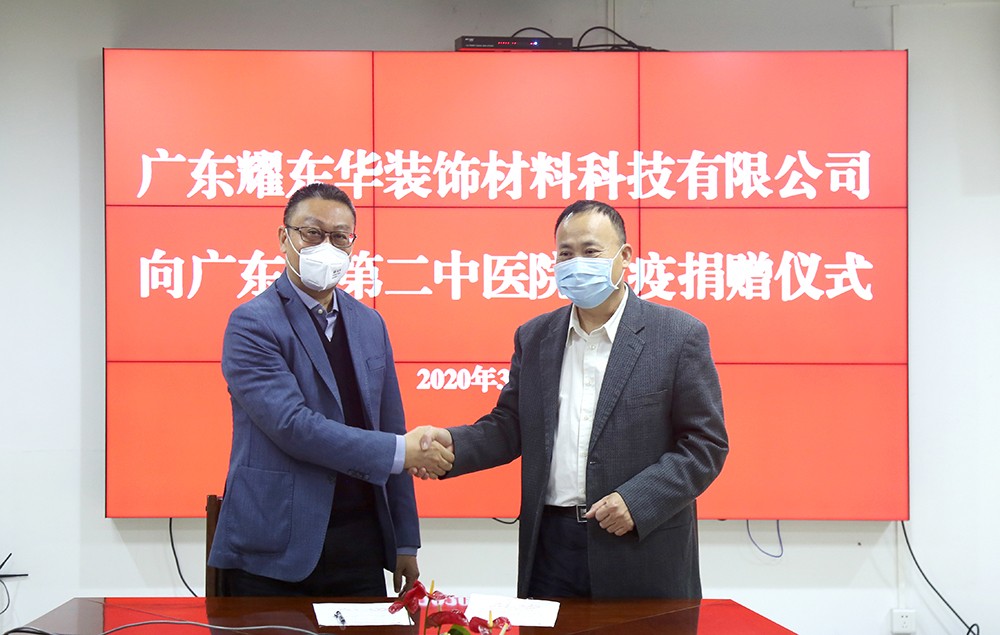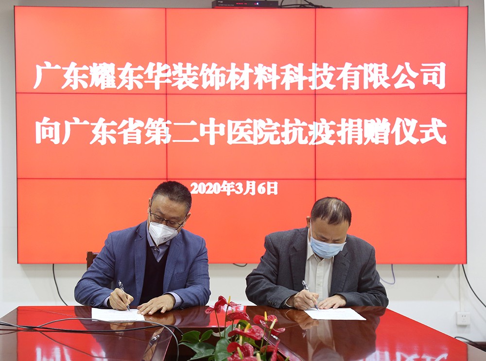 2020年3月6日下午,廣東耀東華裝飾材料科技有限公司向廣東省第二中醫(yī)院捐贈(zèng)一批“紅棉花”牌抗菌防霉飾面刨花板定制的家具,用于改善醫(yī)院呼吸科醫(yī)護(hù)人員及病人的環(huán)境,共同抗擊新肺疫情,捐贈(zèng)儀式在廣東省第二中醫(yī)院舉行。