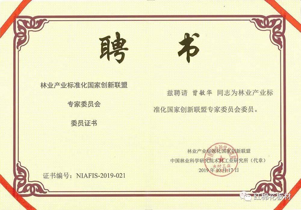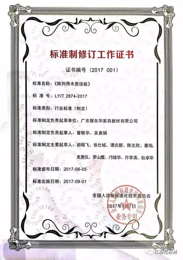 耀東華公司——曾敏華本人,現(xiàn)被國家林業(yè)標(biāo)準(zhǔn)化國家創(chuàng)新聯(lián)盟聘請(qǐng)為專家委員會(huì)委員。他主導(dǎo)編制的行業(yè)標(biāo)準(zhǔn)《陳列用木質(zhì)掛板》被標(biāo)準(zhǔn)審定小組評(píng)定為國際一般水平。