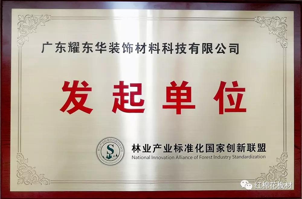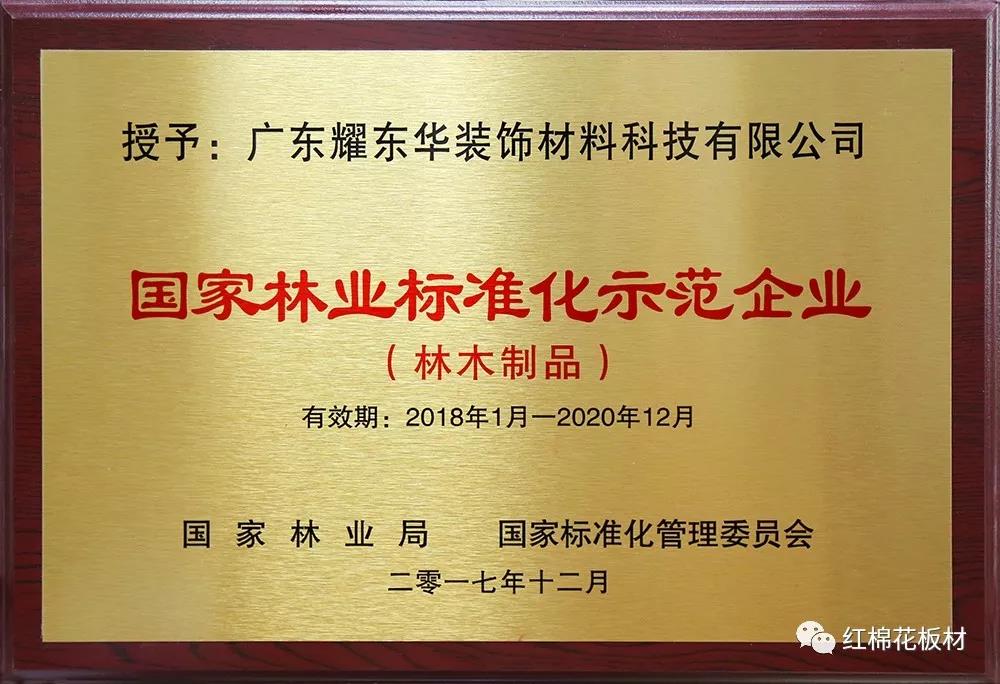 標(biāo)準(zhǔn)是行業(yè)的法典,是否科學(xué),關(guān)系著整個(gè)行業(yè)的健康有序發(fā)展。耀東華公司成立于1995年,專注于“紅棉花”牌飾面人造板的研發(fā)、生產(chǎn)和銷售,25年來,參與制修訂國家/企業(yè)標(biāo)準(zhǔn)40余項(xiàng),為人造板、定制家居行業(yè)的標(biāo)準(zhǔn)化發(fā)展提供了可借鑒的經(jīng)驗(yàn),在2017年,耀東華公司榮獲國家林業(yè)局、國家標(biāo)準(zhǔn)化管理委員會(huì)頒發(fā)的“國家標(biāo)準(zhǔn)化示范企業(yè)”,向公眾展示了行業(yè)領(lǐng)導(dǎo)品牌的風(fēng)范。