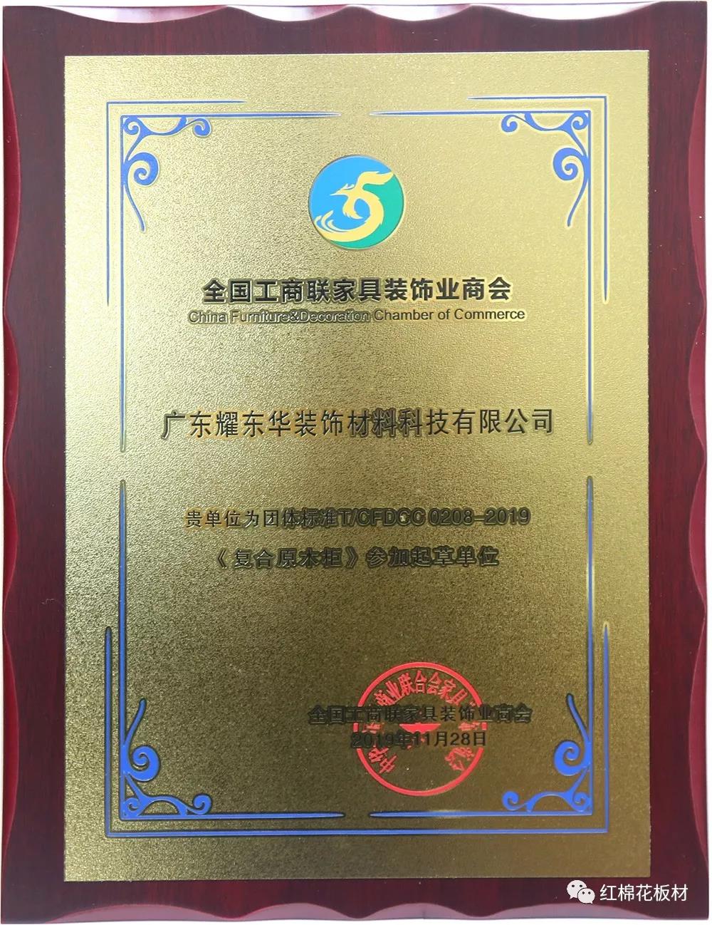 耀東華公司還是團(tuán)體標(biāo)準(zhǔn)T/CFDCC 0209-2019《實(shí)木定制家居產(chǎn)品安裝服務(wù)規(guī)范》參加起草單位、團(tuán)體標(biāo)準(zhǔn)T/CFDCC 0209-2019《復(fù)合原木柜》參加起草單位。